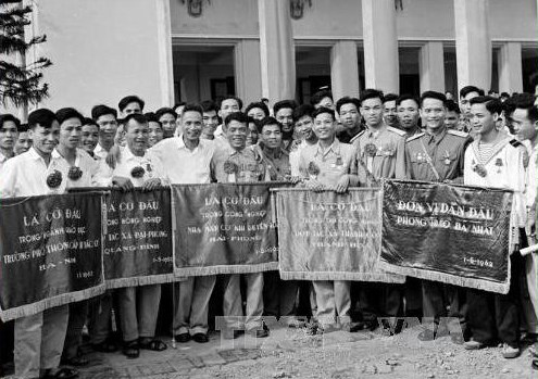 | Thủ tướng Phạm Văn Đồng với 5 đơn vị (Đại Phong, Ba Nhất, Duyên Hải, Bắc Lý, Thành Công) đạt danh hiệu Lá cờ đầu trong phong trào thi đua tại Đại hội thi đua lần thứ III (1962). Ảnh: Tư liệu |