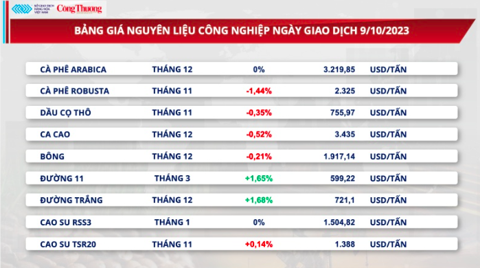 Sở Giao dịch Hàng hoá Việt Nam (MXV) thông tin, kết thúc ngày giao dịch 9/10, giá cà phê Robusta giảm thêm 1,44%, về mức thấp nhất kể từ tháng 4/2023. Việt Nam đã bắt đầu thu hoạch cà phê vụ mới nên tâm lý thị trường tích cực hơn về nguồn cung, từ đó gây sức ép lên giá.
