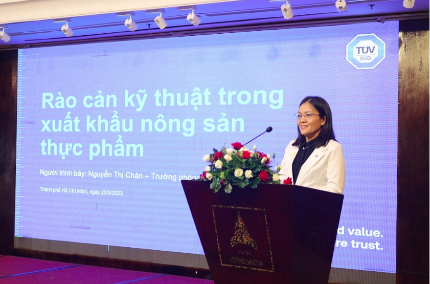 Tại hội thảo, bà Nguyễn Thị Chân, Trưởng phòng Thực phẩm, Công ty TÜV SÜD Việt Nam đã chia sẻ cho các doanh nghiệp về xu hướng tiêu dùng và tình hình xuất khẩu lương thực, thực phẩm của Việt Nam, cũng như cập nhật các quy định nhập khẩu và yêu cầu kỹ thuật, rào cản kỹ thuật trong thương mại của các thị trường lớn.