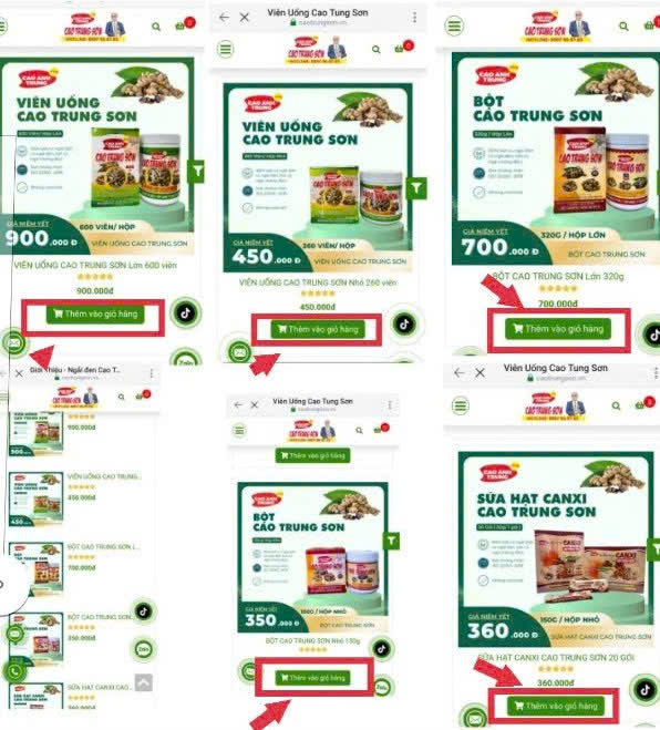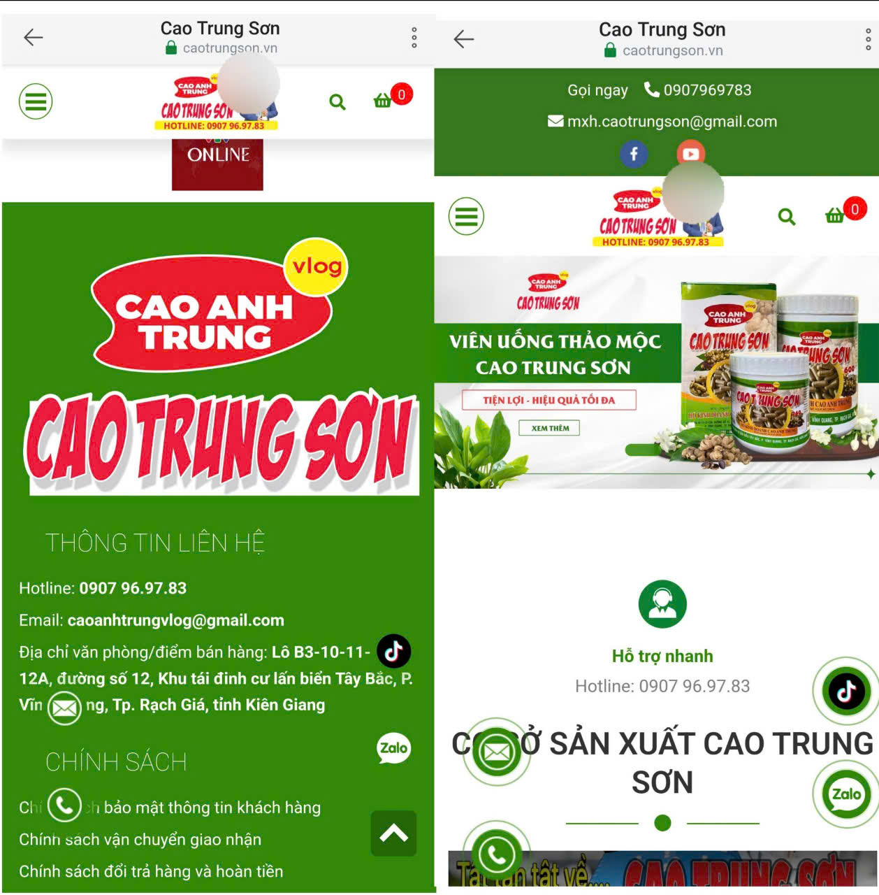 Theo quan sát tại địa chỉ website https://caotrungson.vn, đây là một nền tảng điện tử thể hiện đầy đủ các đặc điểm của một website TMĐT bán hàng: có danh mục sản phẩm, mô tả chi tiết sản phẩm, giá niêm yết, nút “thêm vào giỏ hàng”, “thanh toán”, “đặt hàng”, và quy trình mua hàng giống như các website TMĐT phổ biến hiện nay. Một số sản phẩm như: Viên uống Cao Trung Sơn có giá từ 450 nghìn đồng/1 hộp đến 900 nghìn đồng/1 hộp; Bột Cao Trung Sơn có giá bán từ 350 nghìn đồng/1 hộp đến 700 nghìn đồng/1 hộp; Sữa hạt Canxi Cao Trung Sơn có giá bán 360 nghìn/1 hộp 150G.