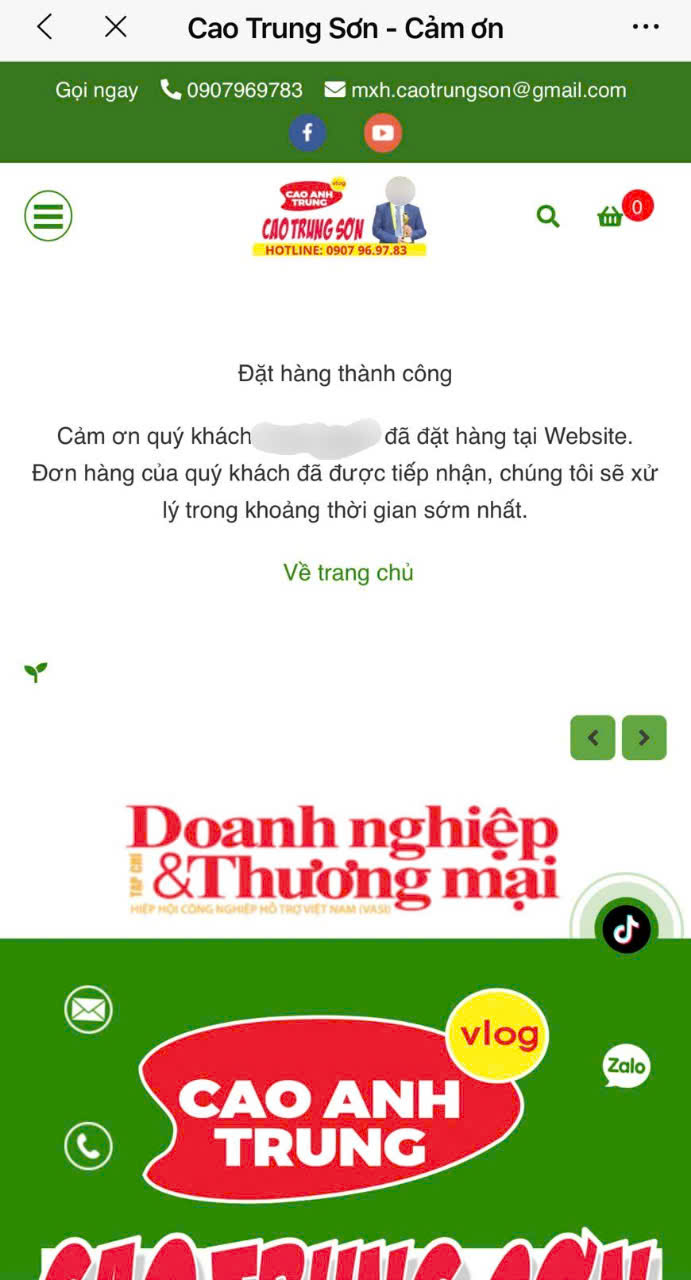 Người tiêu dùng đặt hàng thành công trên https://caotrungson.vn.