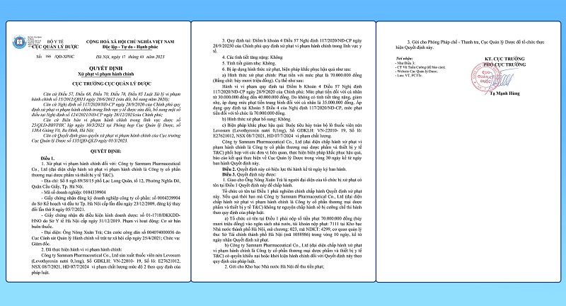 Cục yêu cầu Công ty Samnam Pharmaceutical Co., Ltd (đại diện chấp hành xử phạt vi phạm hành chính là Công ty cổ phần thương mại dược phẩm và thiết bị y tế T&C) nhanh chóng tiến hành và triển khai các biện pháp khắc phục hậu quả: Buộc tiêu hủy toàn bộ lô thuốc viên nén Levosum (Levothyroxin natri 0,1mg), Số GĐKLH: VN-22010- 19, Số lô: E27621012, NSX 08/7/2021, HD 07/7/2024 vi phạm chất lượng.