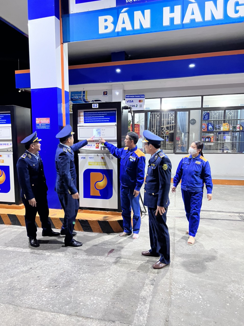 Lực lượng quản lý thị trường kiểm tra một cửa hàng xăng dầu.