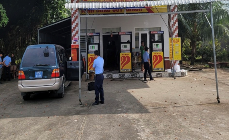 Lực lượng chức năng kiểm tra hoạt động kinh doanh xăng dầu tại cửa hàng.