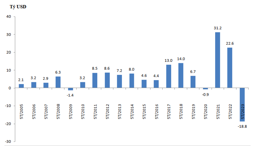 Tuy nhiên, xuất khẩu hàng hóa trong 5 tháng năm 2023 đã giảm rất mạnh tới 18,8 tỷ USD so với cùng kỳ năm trước. Theo số liệu mới công bố của Tổng cục Hải quan, tổng kim ngạch xuất khẩu hàng hóa của Việt Nam trong 5 tháng đầu năm chỉ đạt 135,22 tỷ USD.