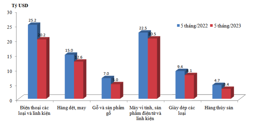 Xét theo nhóm hàng xuất khẩu, có 6 nhóm hàng có mức giảm 1 tỷ USD trở lên chỉ trong 5 tháng đầu năm nay.