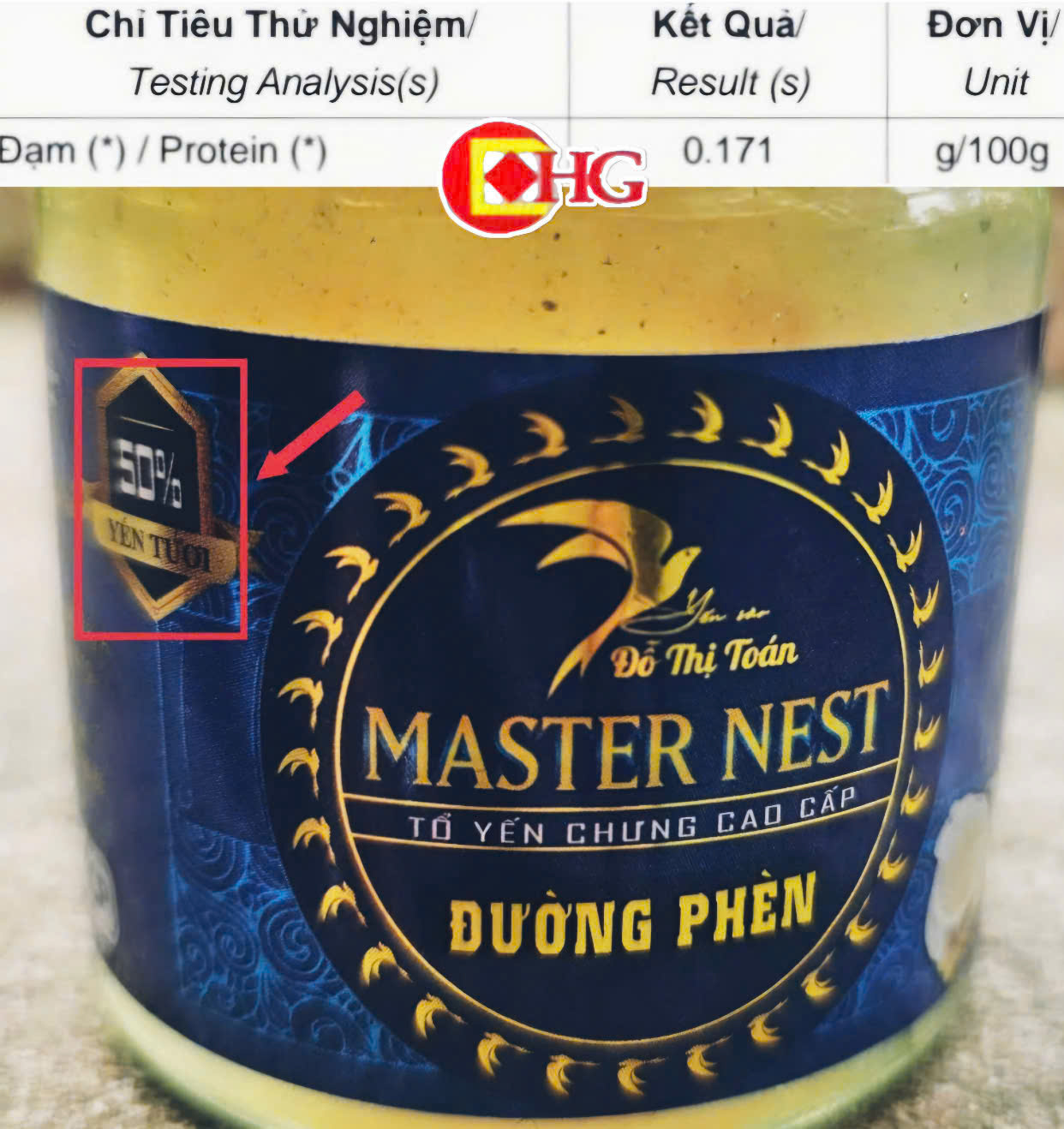 Yến chưng đường phèn mang thương hiệu Đỗ Thị Toán trên nhãn ghi 50% yến tươi, thế nhưng hàm lượng đạm/protein chỉ đạt 0.171g/100g.