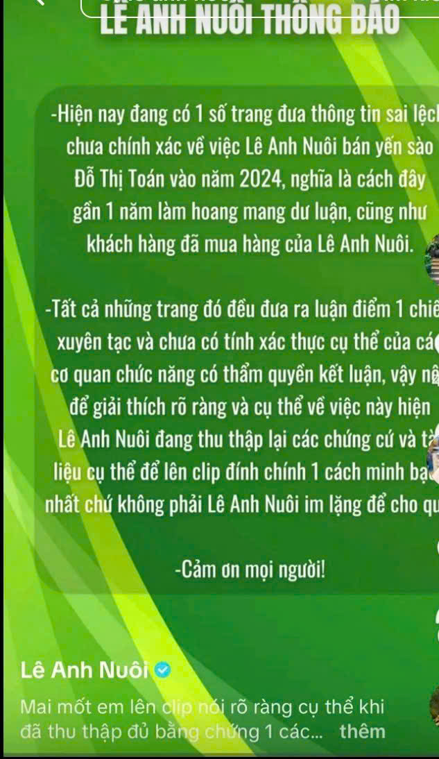 Liên quan đến sản phẩm yến sào mang thương hiệu Đỗ Thị Toán, trong một thông báo đang lan truyền chóng mặt trên nền tảng mạng xã hội (phóng viên đã chuyển thông tin trên tới hot TikToker "Lê Anh Nuôi", nhưng người này “né” trả lời), trong đó có nội dung “đáp trả” người tiêu dùng: “…Thông tin một chiều, xuyên tạc, sai sự thật… sẽ thu thập thông tin và chọn cách im lặng”.