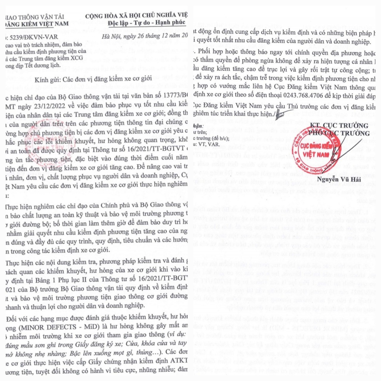 Trước đó ít ngày, Cục Đăng kiểm Việt Nam đã ra văn bản số 5239/ ĐKVN- VAR gửi đến các đơn vị đăng kiểm xe cơ giới về việc nâng cao vai trò trách nhiệm, đảm bảo phục vụ tốt nhu cầu kiểm định phương tiện của người dân tại các trung tâm đăng kiểm xe cơ giới trong dịp Tết dương lịch .