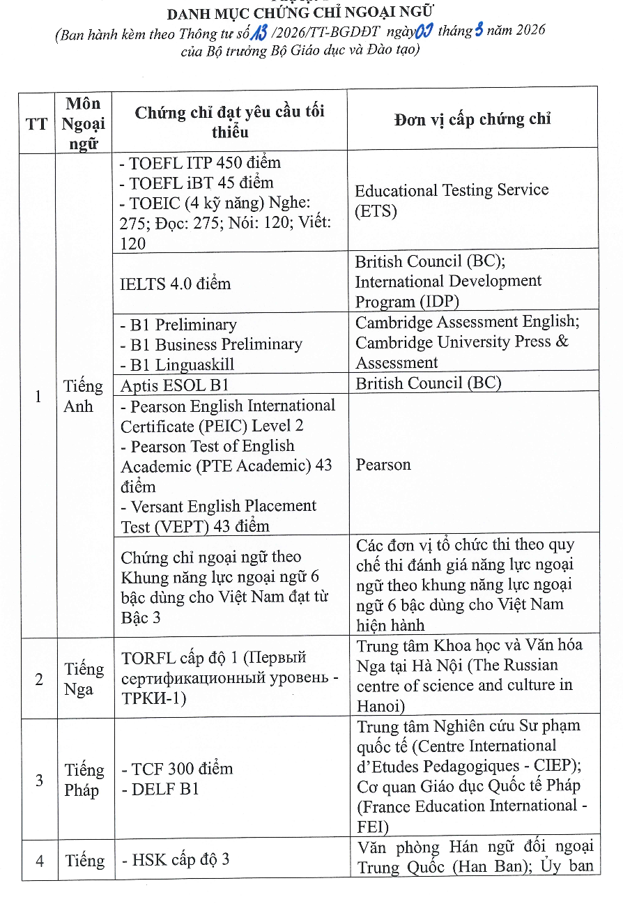 Bộ GD&ĐT mới ban hành Thông tư số 13/2026 về việc sửa đổi, bổ sung một số điều của Quy chế thi tốt nghiệp trung học phổ thông ban hành kèm theo Thông tư số 24/2024. Trong đó có quy định danh sách chứng chỉ ngoại ngữ được miễn thi tốt nghiệp THPT 2026.