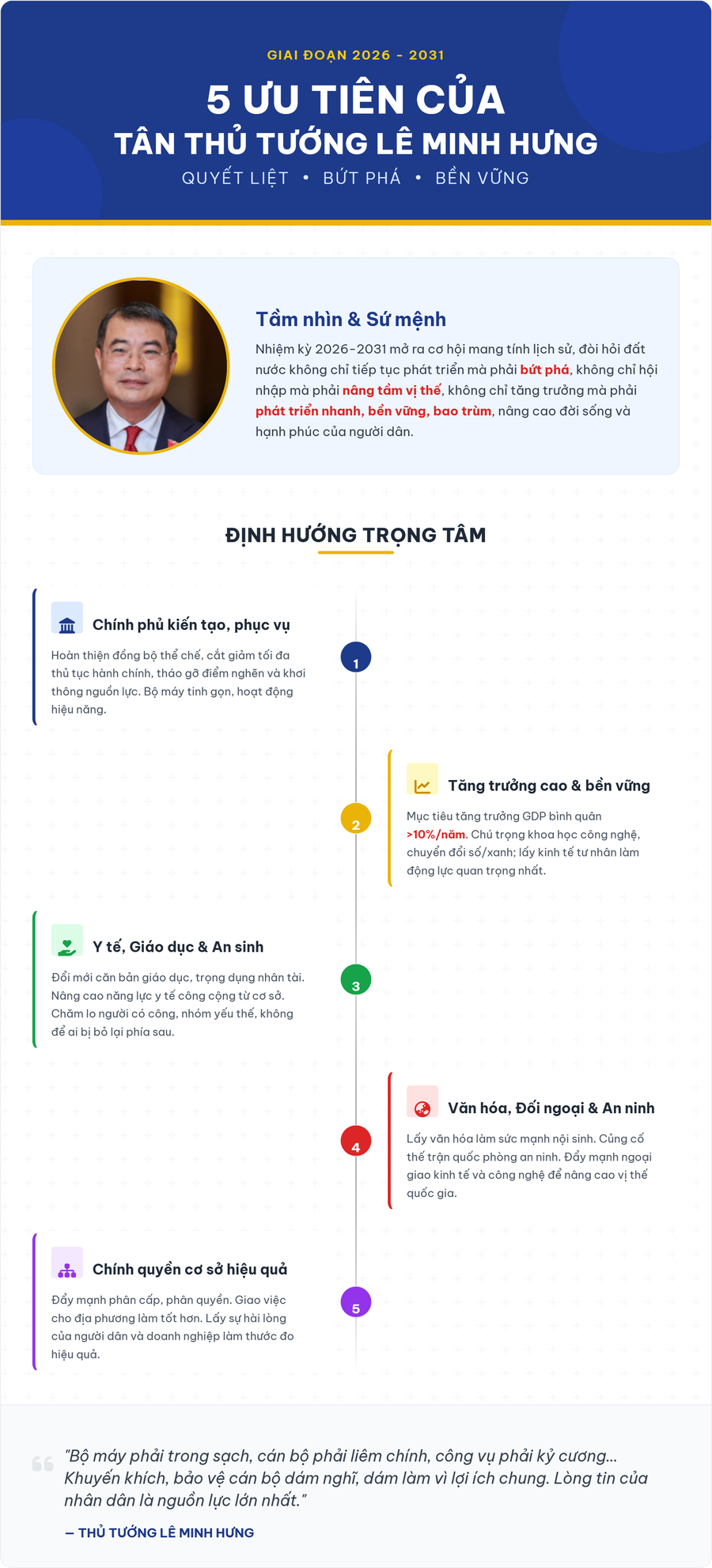 Chiều ngày 7/4, Quốc hội thông qua Nghị quyết bầu đồng chí Lê Minh Hưng, Ủy viên Bộ Chính trị, Bí thư Trung ương Đảng, Trưởng Ban Tổ chức Trung ương giữ chức Thủ tướng Chính phủ nước Cộng hòa xã hội chủ nghĩa Việt Nam nhiệm kỳ 2026-2031. Phát biểu sau nghi lễ tuyên thệ nhậm chức, tân Thủ tướng Chính phủ Lê Minh Hưng cho biết, ông ý thức sâu sắc vinh dự đi kèm trách nhiệm nặng nề trước Tổ quốc, nhân dân và yêu cầu phát triển nhanh, bền vững. Nhiệm kỳ 2026-2031 mở ra cơ hội mang tính lịch sử, đòi hỏi đất nước không chỉ tiếp tục phát triển mà phải bứt phá, không chỉ hội nhập mà phải nâng tầm vị thế, không chỉ tăng trưởng mà phải phát triển nhanh, bền vững, bao trùm, nâng cao đời sống và hạnh phúc của người dân. Từ yêu cầu đó, ông xác định 5 định hướng trọng tâm. Trước hết là xây dựng Chính phủ hiện đại, kiến tạo, phục vụ nhân dân. Trọng tâm là hoàn thiện đồng bộ thể chế, rà soát, sửa đổi các quy định pháp luật, cắt giảm tối đa thủ tục hành chính, tháo gỡ các điểm nghẽn, khơi thông nguồn lực, đồng thời xây dựng bộ máy tinh gọn, hoạt động hiệu năng, hiệu lực, hiệu quả. Thủ tướng yêu cầu mỗi thành viên Chính phủ phải nói đi đôi với làm, điều hành bằng tư duy quản trị hiện đại, chủ động và linh hoạt. ![]() Trong điều hành kinh tế, Chính phủ đặt mục tiêu đạt tăng trưởng cao và bền vững. Thủ tướng nêu rõ mục tiêu tăng trưởng GDP bình quân trên 10% mỗi năm trong giai đoạn 2026-2031 là mệnh lệnh phát triển. Để thực hiện, Chính phủ xác định khoa học, công nghệ, đổi mới sáng tạo và chuyển đổi số quốc gia là đột phá quan trọng hàng đầu, tạo động lực nâng cao năng suất, năng lực cạnh tranh, tự chủ chiến lược, đồng thời thúc đẩy hình thành các động lực tăng trưởng mới, phát triển hạ tầng đồng bộ, đẩy mạnh chuyển đổi xanh và thích ứng biến đổi khí hậu. Cơ cấu nền kinh tế tiếp tục được xác định với kinh tế nhà nước giữ vai trò chủ đạo, kinh tế tư nhân là động lực quan trọng nhất. Chính phủ bảo đảm mọi địa phương, doanh nghiệp và người dân có cơ hội tham gia, đóng góp và hưởng lợi công bằng từ tăng trưởng. Song song với phát triển kinh tế, Chính phủ cam kết dành nguồn lực để đổi mới căn bản giáo dục, đào tạo, phát triển nguồn nhân lực chất lượng cao và trọng dụng nhân tài. Hệ thống y tế công cộng được nâng cao năng lực, chăm sóc sức khỏe người dân ngay từ cơ sở. Các chính sách an sinh xã hội tiếp tục được thực hiện hiệu quả, bảo đảm chăm lo người có công, nhóm yếu thế và không để ai bị bỏ lại phía sau. Văn hóa được xác định là nền tảng, sức mạnh nội sinh của dân tộc. Quốc phòng, an ninh tiếp tục được củng cố, xây dựng thế trận quốc phòng toàn dân gắn với thế trận an ninh nhân dân vững chắc. Trên đối ngoại, Chính phủ kiên định đường lối độc lập, tự chủ, đồng thời đẩy mạnh ngoại giao kinh tế và ngoại giao công nghệ nhằm nâng cao vị thế quốc gia. Đối với bộ máy chính quyền địa phương hai cấp vận hành từ giữa năm 2025, Thủ tướng cho biết nhiệm vụ trọng tâm là bảo đảm vận hành thực chất, hiệu lực, hiệu quả, trở thành động lực phát triển mới. Chính phủ sẽ tiếp tục đẩy mạnh phân cấp, phân quyền gắn với phân bổ nguồn lực hợp lý, nâng cao năng lực đội ngũ cán bộ, đặc biệt ở cấp xã, phường, đặc khu. Thủ tướng nhấn mạnh nguyên tắc việc gì địa phương làm tốt hơn thì giao địa phương quyết, qua đó phát huy tính chủ động, linh hoạt, dám nghĩ, dám làm, dám chịu trách nhiệm của chính quyền cơ sở, lấy sự hài lòng của người dân và doanh nghiệp làm thước đo. Chính phủ cũng xác định tăng cường phối hợp chặt chẽ với các cơ quan Đảng, Quốc hội, Mặt trận Tổ quốc, các tổ chức chính trị - xã hội, cộng đồng doanh nghiệp và nhân dân để thực hiện các mục tiêu phát triển. Nhấn mạnh yêu cầu xây dựng Chính phủ liêm chính, kỷ luật, bản lĩnh, trách nhiệm, Thủ tướng khẳng định lòng tin của nhân dân là nguồn lực lớn nhất. Bộ máy phải trong sạch, cán bộ phải liêm chính, công vụ phải kỷ cương; tình trạng né tránh, vô cảm sẽ bị xử lý nghiêm, đồng thời khuyến khích, bảo vệ cán bộ dám nghĩ, dám làm vì lợi ích chung. Thủ tướng Lê Minh Hưng khẳng định: "Tôi xin hứa sẽ cùng tập thể Chính phủ, các bộ ngành, địa phương đoàn kết một lòng, quyết tâm đưa đất nước bước vào giai đoạn phát triển bứt phá, giàu mạnh, phồn vinh, văn minh, hạnh phúc |