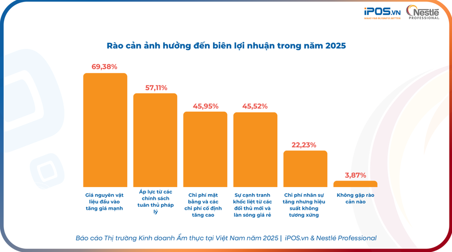 Theo báo cáo thị trường kinh doanh ẩm thực Việt Nam năm 2025 do iPOS.vn và Nestlé Professional công bố, quy mô ngành F&B trong năm qua đạt hơn 726.500 tỷ đồng, tăng trưởng 5,5%. Toàn thị trường có khoảng 329.500 cửa hàng, tăng 2% so với năm 2024, cho thấy đà phát triển dương dù nửa đầu năm ghi nhận hơn 50.000 điểm bán đóng cửa. Điểm nghẽn lớn nhất của các tổ chức kinh doanh hiện tại nằm ở biên lợi nhuận khi phải chịu tác động kép từ lạm phát và yêu cầu chuẩn hóa hoạt động. Khảo sát chỉ ra 69% doanh nghiệp xem việc nguyên vật liệu tăng giá mạnh là rào cản lớn nhất, cá biệt một số mặt hàng đầu vào đội giá từ 30% đến 40%. Tiếp theo đó, 57% doanh nghiệp chịu sức ép từ chính sách tuân thủ pháp lý và gần 46% đơn vị gặp khó vì chi phí mặt bằng cùng các khoản phí cố định. Sự gia tăng này diễn ra cùng thời điểm chỉ số giá tiêu dùng năm 2025 tăng 3,31%.