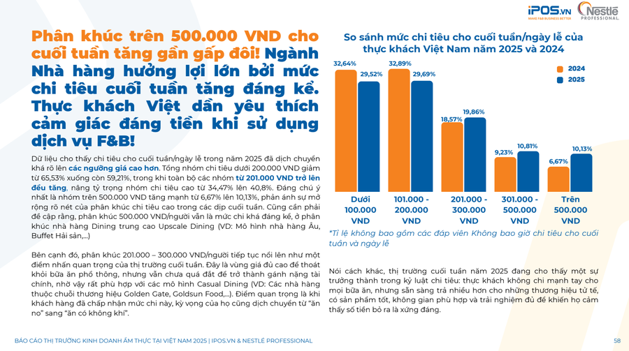 Tỷ trọng nhóm khách hàng chi trả từ 201.000 đồng trở lên cho các dịp cuối tuần tăng từ 34% lên 41%. Phân khúc chi tiêu trên 500.000 đồng cũng nhích lên mốc 10%. Xu hướng này thể hiện rõ ở thị trường đồ uống khi phân khúc giá trên 35.000 đồng gia tăng tỷ trọng lên 58%, tạo áp lực lớn lên nhóm cửa hàng giá rẻ. Dù vậy, kỳ vọng tiêu dùng năm 2026 mang màu sắc thận trọng khi tỷ lệ người dùng dự kiến cắt giảm chi tiêu tăng lên mức 34%. Dựa trên các dữ liệu thực tế, quy mô ngành F&B năm 2026 được dự báo đạt mức 333.600 cửa hàng và đem về doanh thu xấp xỉ 759.919 tỷ đồng. Thị trường đã chính thức bước qua giai đoạn phát triển nóng, lợi thế cạnh tranh giờ đây thuộc về những hệ thống có năng lực tối ưu vận hành và tuân thủ nghiêm ngặt các quy định pháp luậ