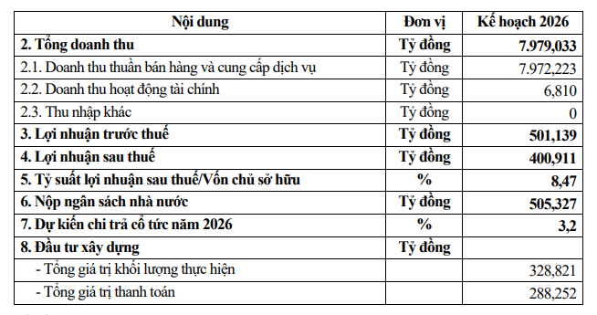 Bước sang năm 2026, công ty đặt mục tiêu tổng doanh thu đạt 7.979 tỷ đồng, tăng 8% so với thực hiện năm 2025. Trong đó, doanh thu thuần từ bán hàng và cung cấp dịch vụ chiếm gần như toàn bộ, đạt 7.972 tỷ đồng.