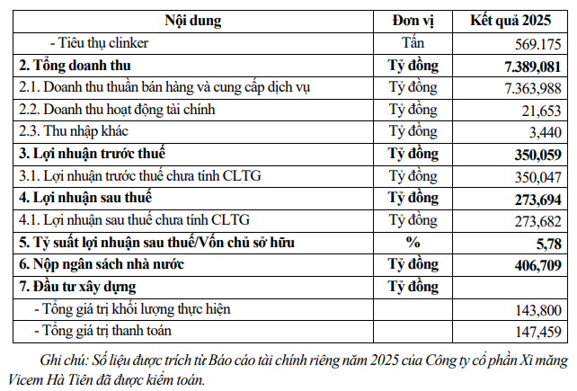Năm 2025, Vicem Hà Tiên ghi nhận doanh thu thuần đạt 7.389 tỷ đồng, tăng 7% so với năm trước. Đáng chú ý, lợi nhuận sau thuế đạt 273,6 tỷ đồng, tăng tới 353%, vượt xa mục tiêu 184 tỷ đồng đã được Đại hội đồng cổ đông thông qua.
