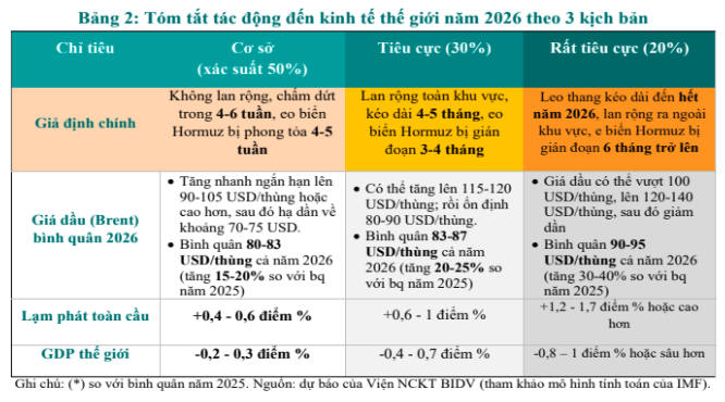 Ở cả ba kịch bản, nguyên nhân chính đến từ giá năng lượng, qua đó làm tăng lạm phát và kéo giảm tăng trưởng. Mức độ tác động phụ thuộc chủ yếu vào thời gian gián đoạn nguồn cung dầu và mức độ lan rộng của xung đột, đây là biến số then chốt của kinh tế thế giới năm 202