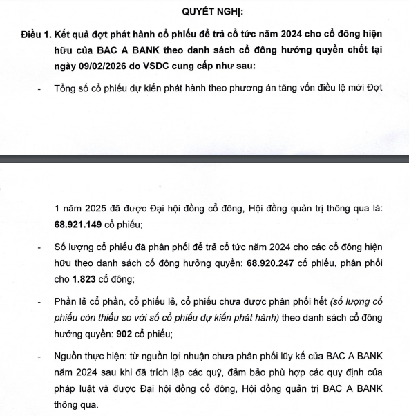 Theo đó, kết thúc đợt phát hành ngày 9/2/2026, Bac A Bank đã hoàn tất phân phối hơn 68,9 triệu cổ phiếu trả cổ tức cho 1.823 cổ đông, còn lại 902 cổ phiếu lẻ sẽ bị hủy bỏ.