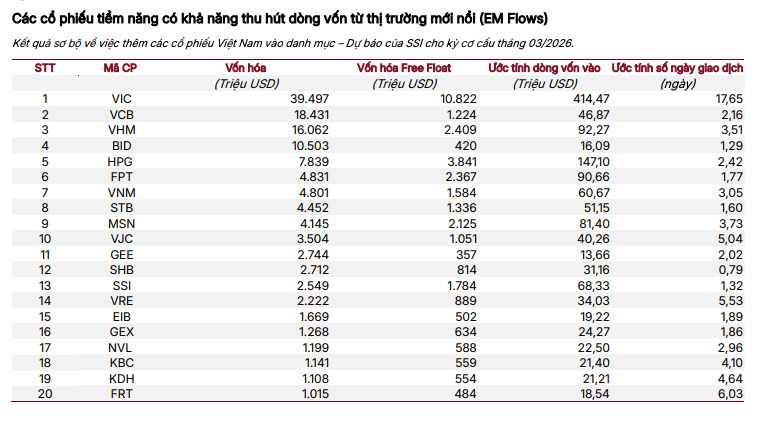 Cùng với đó, SSI Research chỉ ra một vài nhóm cổ phiếu có thể thu hút hàng chục triệu USD dòng vốn từ thị trường mới nổi, như VCB (+46,8 triệu USD), VHM (+92,2 triệu USD), BID (+16 triệu USD, HPG (+147 tỷ đồng), FPT (+90,6 triệu USD), VNM (+60,6 triệu USD).