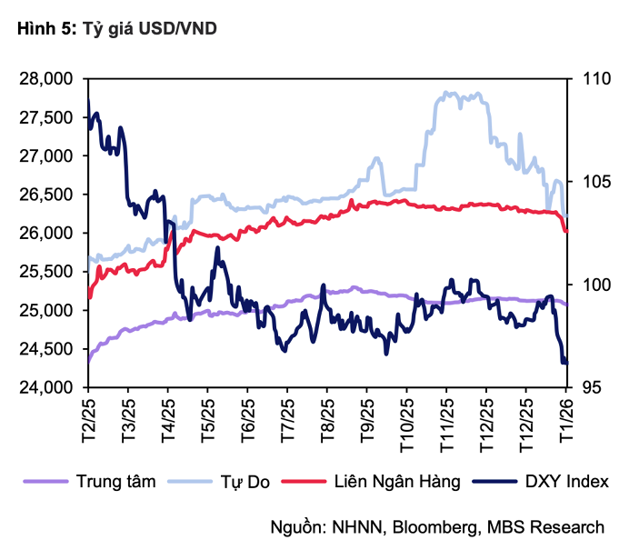 Dẫn số liệu từ báo cáo, tỷ giá liên ngân hàng đến cuối tháng 1 giảm 0,9% so với đầu tháng về mức 26.025 VND/USD - mức thấp nhất kể từ giữa tháng 6/2025. Tỷ giá trung tâm cũng giảm 0,2% so với đầu năm về mức 25.074 VND/USD; trong khi tỷ giá tự do giảm mạnh 2,6% so với đầu năm, hiện ở mức 26.225 VND/USD.