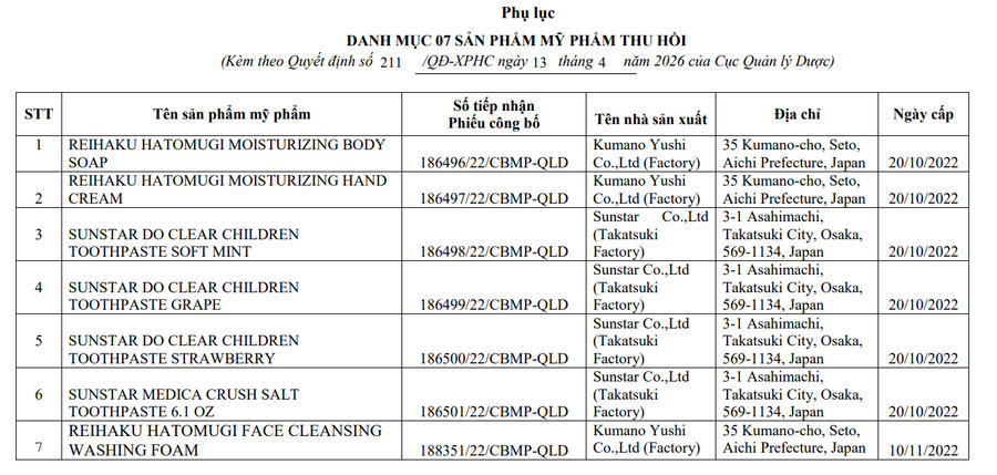 Cụ thể, Công ty TNHH Lotus An Việt (trụ sở tại TP Hải Phòng) đã không cung cấp Hồ sơ thông tin sản phẩm đối với 7 sản phẩm mỹ phẩm trong thời hạn quy định, vi phạm quy định tại Nghị định 117/2020/NĐ-CP của Chính phủ, được sửa đổi, bổ sung tại Nghị định 124/2021/NĐ-CP. ![]() Với hành vi vi phạm nêu trên, Cục Quản lý Dược xử phạt Công ty TNHH Lotus An Việt số tiền 75 triệu đồng. Đồng thời, áp dụng biện pháp khắc phục hậu quả, buộc thu hồi 7 số tiếp nhận phiếu công bố sản phẩm mỹ phẩm và tiêu hủy toàn bộ 7 sản phẩm liên quan. Danh mục các sản phẩm bị thu hồi gồm: REIHAKU HATOMUGI Moisturizing Body Soap; REIHAKU HATOMUGI Moisturizing Hand Cream; SUNSTAR Do Clear Children Toothpaste (các vị Soft Mint, Grape, Strawberry); SUNSTAR Medica Crush Salt Toothpaste; và REIHAKU HATOMUGI Face Cleansing Washing Foam. ![]() Cục Quản lý Dược yêu cầu Công ty TNHH Lotus An Việt có trách nhiệm nộp phạt trong thời hạn 10 ngày kể từ khi nhận quyết định, đồng thời phối hợp với các đơn vị liên quan để thực hiện biện pháp khắc phục hậu quả và báo cáo kết quả về Cục Quản lý Dược trong vòng 30 ngà |