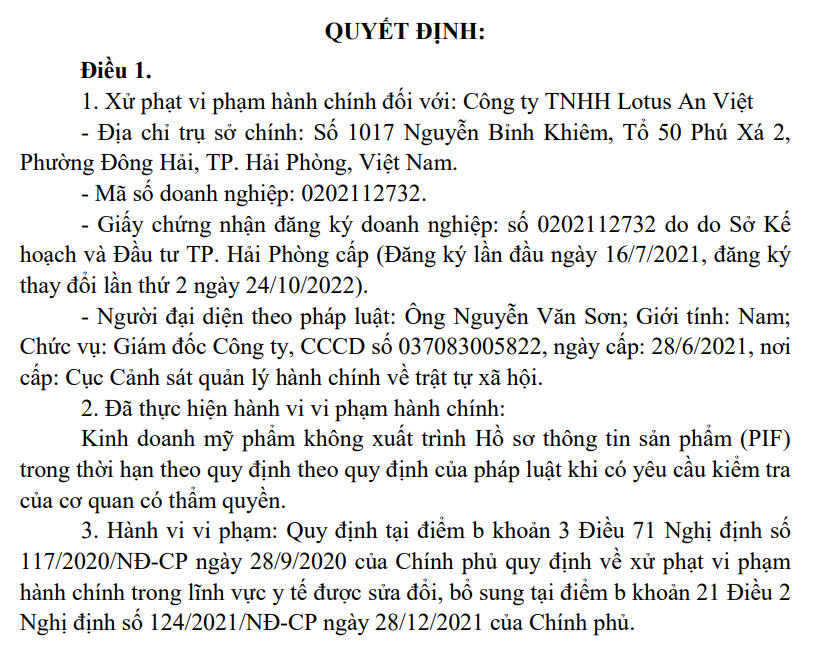 Cục Quản lý Dược (Bộ Y tế) vừa ban hành quyết định xử phạt vi phạm hành chính đối với Công ty TNHH Lotus An Việt do có hành vi kinh doanh mỹ phẩm không xuất trình hồ sơ thông tin sản phẩm (PIF) khi cơ quan chức năng yêu cầu kiểm tra theo quy định pháp luật.