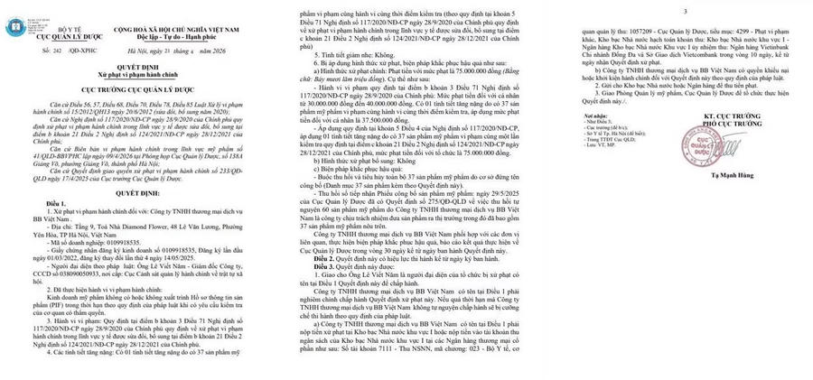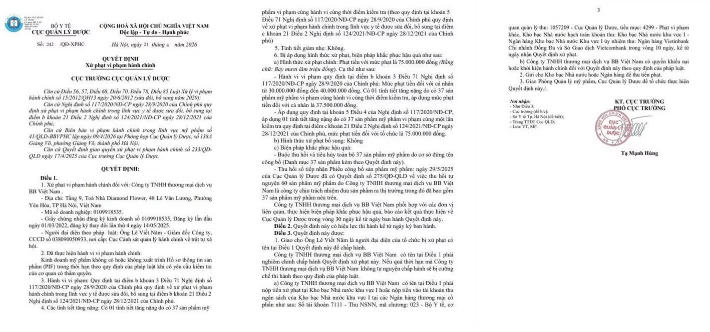 Cục Quản lý dược thuộc Bộ Y tế vừa ban hành quyết định xử phạt vi phạm hành chính đối với Công ty TNHH Thương mại Dịch vụ BB Việt Nam do có những sai phạm nghiêm trọng trong việc quản lý hồ sơ mỹ phẩm. Theo đó, đơn vị này bị xử phạt số tiền 75 triệu đồng và buộc phải tiêu hủy hàng chục mặt hàng mỹ phẩm vốn đang lưu thông rộng rãi trên thị trường do không có đầy đủ hồ sơ thông tin sản phẩm theo quy định pháp luật hiện hành. ![]() Cụ thể, danh mục các sản phẩm bị buộc thu hồi và tiêu hủy bao gồm 37 loại mỹ phẩm thuộc nhiều thương hiệu nổi tiếng và được người tiêu dùng Việt Nam sử dụng phổ biến như Anessa, Shiseido, Hada Labo. Việc thiếu hồ sơ thông tin sản phẩm (PIF) được cơ quan chức năng xác định là lỗi vi phạm nghiêm trọng, bởi đây là tài liệu căn bản để xác định thành phần, nguồn gốc và mức độ an toàn của sản phẩm trước khi đến tay người dùng. Khi thiếu các hồ sơ này, cơ quan quản lý không thể kiểm soát được chất lượng thực tế, dẫn đến những rủi ro tiềm ẩn cho sức khỏe của khách hàng. Ngoài hình thức phạt tiền, doanh nghiệp vi phạm còn chịu hình phạt bổ sung là đình chỉ tiếp nhận hồ sơ công bố mỹ phẩm mới trong thời hạn 6 tháng, đồng thời phải nghiêm túc thực hiện các biện pháp khắc phục hậu quả trong thời gian quy định. Trong bối cảnh thị trường mỹ phẩm diễn biến phức tạp, ngành y tế khẳng định sẽ tiếp tục tăng cường công tác hậu kiểm và siết chặt quản lý nhằm bảo vệ quyền lợi và sự an toàn của người tiêu dùng. Cơ quan chức năng yêu cầu doanh nghiệp phối hợp với các đơn vị liên quan để hoàn tất việc thu hồi và tiêu hủy sản phẩm, đồng thời báo cáo kết quả trong vòng 30 ngày kể từ ngày ban hành quyết định. Quyết định xử phạt có hiệu lực ngay khi ký. Doanh nghiệp phải thực hiện nghĩa vụ nộp phạt trong thời hạn 10 ngày, nếu không sẽ bị cưỡng chế theo quy định. Trong trường hợp không đồng ý, doanh nghiệp có quyền thực hiện khiếu nại hoặc khởi kiện hành chính đối với quyết định xử phạt này. |
