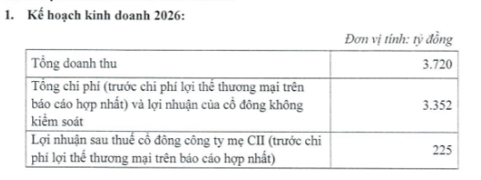 Năm 2026, CII đặt mục tiêu doanh thu đạt 3.720 tỷ đồng và lợi nhuận sau thuế thuộc về cổ đông công ty mẹ ở mức 225 tỷ đồng.