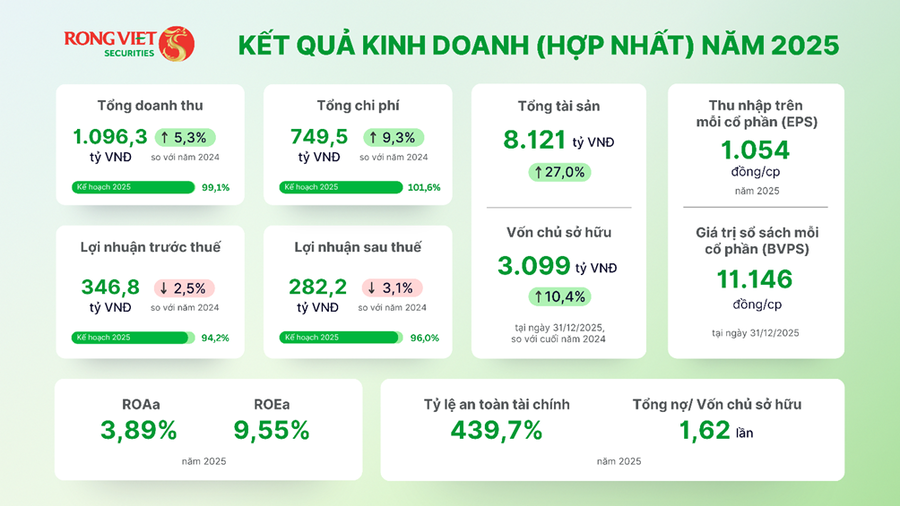 Năm 2025, với tình hình thị trường có nhiều biến động và áp lực cạnh tranh gia tăng, Rồng Việt ghi nhận tổng doanh thu hợp nhất đạt 1.096,3 tỷ đồng và lợi nhuận sau thuế 282,2 tỷ đồng, lần lượt hoàn thành 99,1% và 94,2% kế hoạch năm. Công ty hoàn tất tăng vốn điều lệ lên 2.720 tỷ đồng. Quy mô tổng tài sản và vốn chủ sở hữu đạt 8.121 tỷ đồng và 3.099 tỷ đồng tại thời điểm cuối năm.