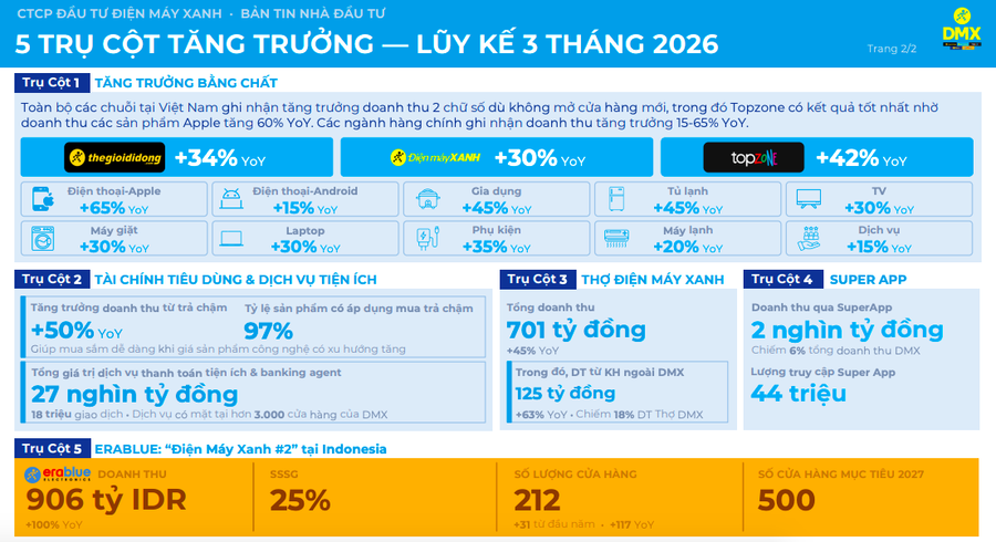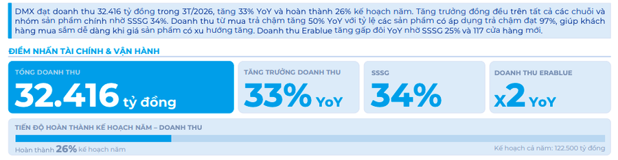 CTCP Đầu tư Điện Máy Xanh (DMX) vừa công bố kết quả kinh doanh quý I/2026 với tăng trưởng hai chữ số ở nhiều mảng. Theo báo cáo đề cập, DMX ghi nhận doanh thu 32.400 tỷ đồng trong quý 1/2026, tăng 33% so với cùng kỳ năm trước và hoàn thành 26% kế hoạch năm nay. ![]() Doanh nghiệp cho biết tăng trưởng diễn ra đồng đều trên tất cả các chuỗi và nhóm sản phẩm chính, với mức tăng trưởng doanh số trên cửa hàng (Same Store Sales Growth - SSSG) đạt 34%. Trong khi đó, doanh thu từ mua trả chậm tăng 50% so với cùng kỳ, với tỷ lệ các sản phẩm có áp dụng trả chậm đạt 97%, giúp khách hàng mua sắm dễ dàng khi giá sản phẩm có xu hướng tăng. ![]() Theo DMX, 5 trụ cột kinh doanh tiếp tục duy trì đà tăng trưởng tích cực trong quý I/2026, phản ánh sự phục hồi rõ nét của sức mua cũng như hiệu quả vận hành. Đáng chú ý, toàn bộ các chuỗi tại Việt Nam đều ghi nhận mức tăng trưởng doanh thu hai chữ số dù không mở rộng mạnh số lượng cửa hàng. Trong đó, TopZone là điểm sáng khi hưởng lợi từ nhu cầu cao đối với các sản phẩm Apple, với doanh thu tăng tới 60% so với cùng kỳ. ![]() Các chuỗi chủ lực cũng duy trì đà tăng trưởng ấn tượng: Thế Giới Di Động (+34%), Điện Máy Xanh (+30%) và TopZone (+42%). Ở cấp độ ngành hàng, nhiều nhóm sản phẩm ghi nhận mức tăng cao như điện thoại Apple (+65%), gia dụng và tủ lạnh (cùng +45%), phụ kiện (+35%), laptop và TV (cùng +30%). Song song với mảng bán lẻ, tài chính tiêu dùng và dịch vụ tiện ích tiếp tục nổi lên như động lực tăng trưởng mới. Doanh thu từ bán hàng trả chậm tăng mạnh 50%, trong khi tỷ lệ sản phẩm áp dụng hình thức này đạt 97%, phản ánh xu hướng tiêu dùng linh hoạt của khách hàng. Tổng giá trị dịch vụ thanh toán tiện ích và banking agent đạt 27.000 tỷ đồng, với hơn 18 triệu giao dịch, hiện diện tại hơn 3.000 cửa hàng trên toàn quốc. Ở mảng dịch vụ, chuỗi Thợ Điện Máy Xanh mang về 701 tỷ đồng doanh thu, tăng 45% so với cùng kỳ. Đáng chú ý, doanh thu từ khách hàng ngoài hệ thống đạt 125 tỷ đồng, tăng 63%, cho thấy khả năng mở rộng ra ngoài hệ sinh thái nội bộ. Trong khi đó, Super App của doanh nghiệp cũng ghi nhận bước tiến rõ rệt với doanh thu khoảng 2.000 tỷ đồng, chiếm 6% tổng doanh thu Điện Máy Xanh, cùng 44 triệu lượt truy cập. Tại Indonesia, Erablue tiếp tục duy trì đà tăng trưởng mạnh với doanh thu đạt 906 tỷ IDR, tăng gấp đôi so với cùng kỳ. Chỉ số SSSG đạt 25%, trong khi số lượng cửa hàng đã nâng lên 212, tiến gần mục tiêu 500 cửa hàng vào năm 2027.