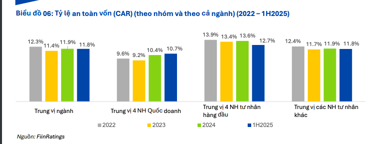 Tỷ lệ an toàn vốn (CAR) duy trì ổn định nhưng không đồng đều. Các ngân hàng quốc doanh cải thiện nhờ bổ sung vốn cấp 2, trong khi nhóm tư nhân lớn chịu áp lực do tài sản rủi ro tăng nhanh. Các ngân hàng nhỏ cũng đối mặt thách thức tương tự, dù đã nỗ lực tăng vốn.