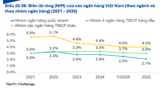 Trong khi tăng trưởng tín dụng chậm lại, lợi nhuận ngành ngân hàng tiếp tục đối mặt với sức ép từ biên lãi ròng (NIM) thu hẹp. Năm 2025, NIM giảm xuống khoảng 2,9% và được dự báo duy trì dưới 3% trong năm 2026 do chi phí vốn tăng và lợi suất cho vay giảm.