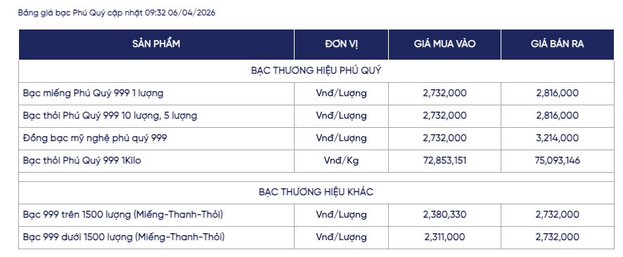 Ở phân khúc bạc miếng, giá bạc Phú Quý 999 hiện được niêm yết tại 2,73 triệu đồng/lượng (mua vào) và 2,81 triệu đồng/lượng (bán ra). Trong khi đó, bạc thỏi 999 loại 1kg của thương hiệu này được giao dịch ở mức 72,8 - 75 triệu đồng/k