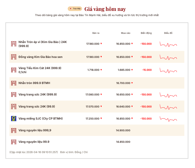 Tin90p.com - Giá vàng ngày 16/4: Vàng thế giới giảm 1%, vàng miếng SJC lùi về mức 172 triệu đồng/lượng