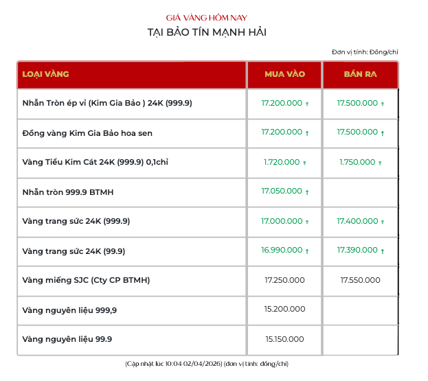 Giá vàng nhẫn Kim Gia Bảo tại Bảo tín Mạnh Hải niêm yết tại 172 - 175 triệu đồng/lượn