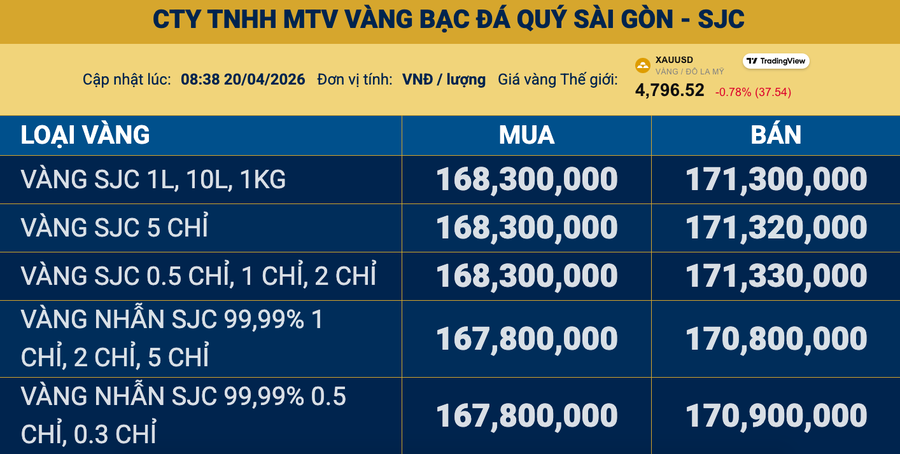Tại Công ty SJC, vàng nhẫn giảm 200.000 đồng/lượng ở chiều mua và 700.000 đồng/lượng ở chiều bán, xuống còn 167,8 - 170,8 triệu đồng/lượng.