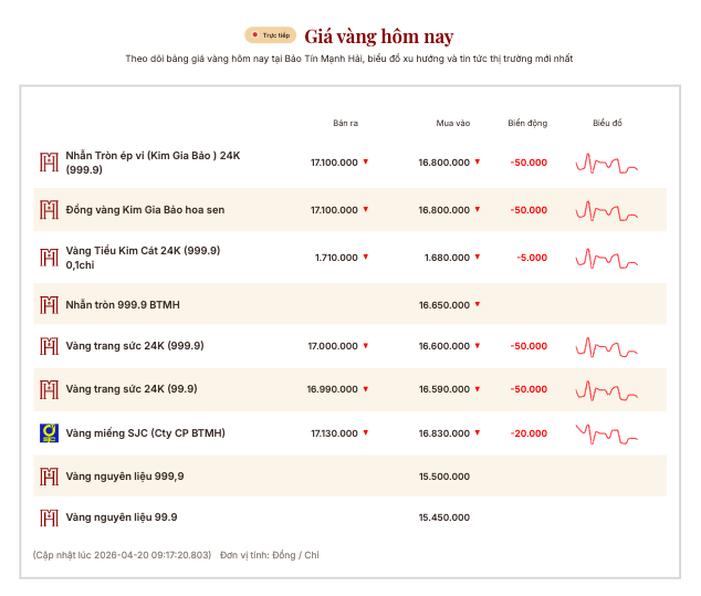 Cùng lúc đó, giá vàng miếng SJC tại Bảo Tín Mạnh Hải niêm yết tại 168,3 - 171,3 triệu đồng/lượng.