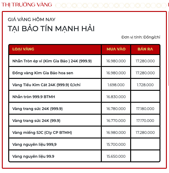Cùng lúc đó, giá vàng miếng SJC tại Bảo tín Mạnh Hải niêm yết giao dịch tại 169,8 - 172,8 triệu đồng/lượng.