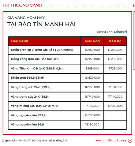 Vàng nhẫn Kim Gia Bảo tại Bảo tín Mạnh Hải giao dịch tại 169,5 - 172,5 triệu đồng/lượn