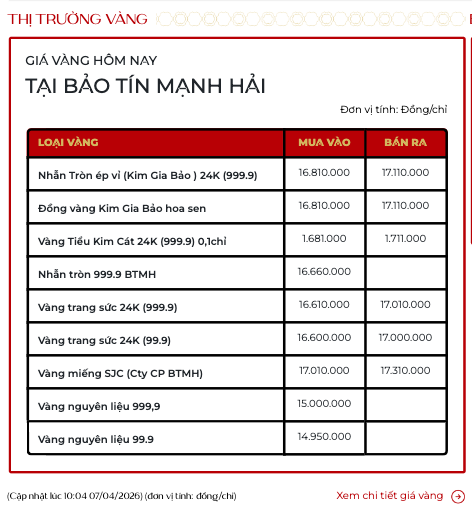 Vàng nhẫn Kim Gia Bảo tại Bảo tín Mạnh Hải niêm yết tại 168,1 - 171,1 triệu đồng/lượn