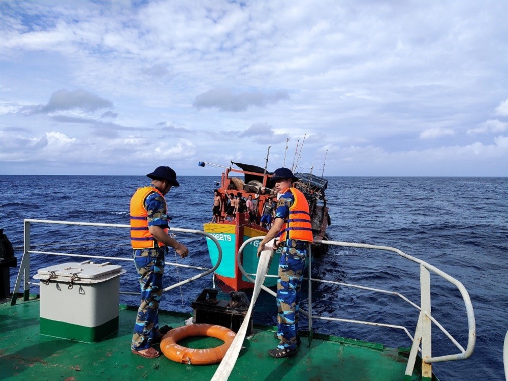 | Tàu trường Sa 22 làm nhiệm vụ cứu hộ giúp ngư dân trên biển. |
