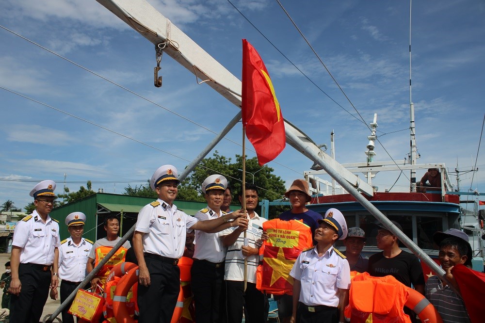 | Cán bộ, chiến sĩ Lữ đoàn 955 trao tặng cờ Tổ quốc, áo phao cho ngư dân. |
