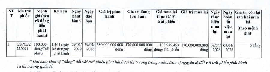 Ngày 9/4/2026, doanh nghiệp này đã mua lại 170 tỷ đồng trái phiếu GSPCB2225001, qua đó tất toán xong lô trái phiếu này.