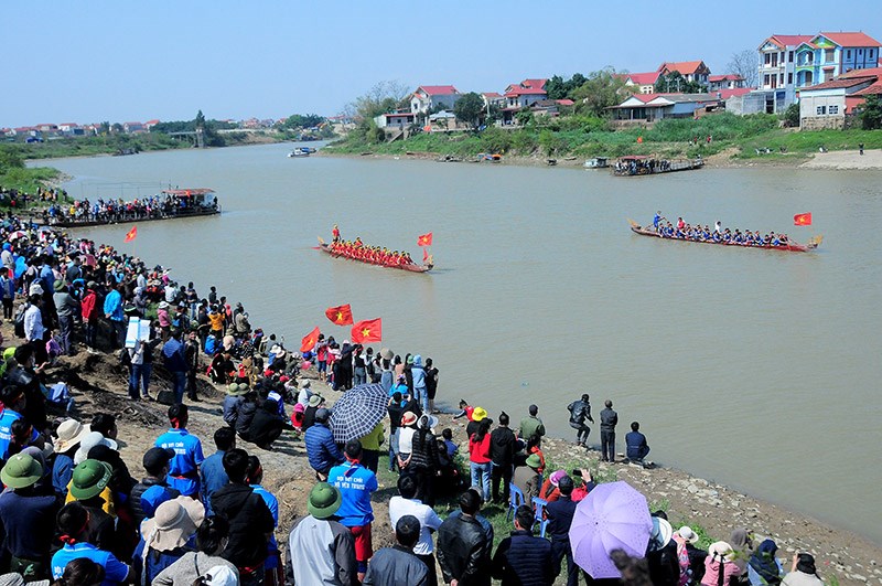 | Người dân sôi nổi tham dự Hội thi bơi chải tại bến sông Như Nguyệt (sông Cầu), xã Tam Giang |