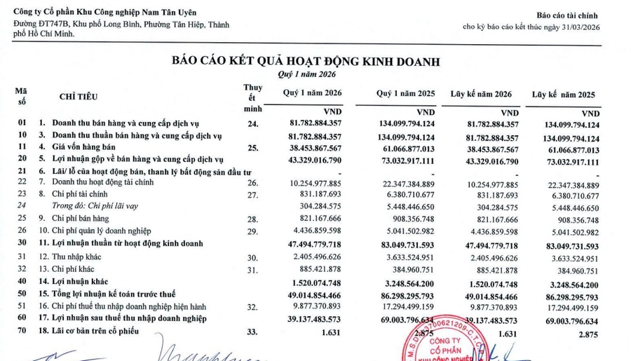CTCP Khu công nghiệp Nam Tân Uyên (mã ck: NTC) vừa công bố kết quả kinh doanh quý I/2026 với con số kém tích cực khicả doanh thu và lợi nhuận đồng loạt sụt giảm mạnh.