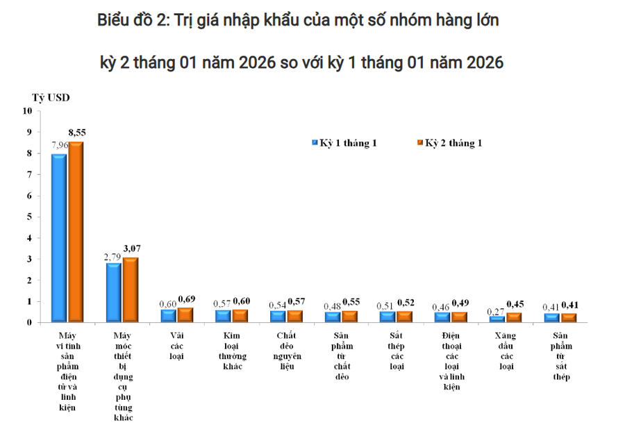 Ở chiều ngược lại, tổng trị giá hàng hóa nhập khẩu của Việt Nam trong kỳ 2 tháng 1/2026 đạt 23,50 tỷ USD, tăng 10,4% (tương ứng tăng 2,21 tỷ USD) so với kỳ trước.