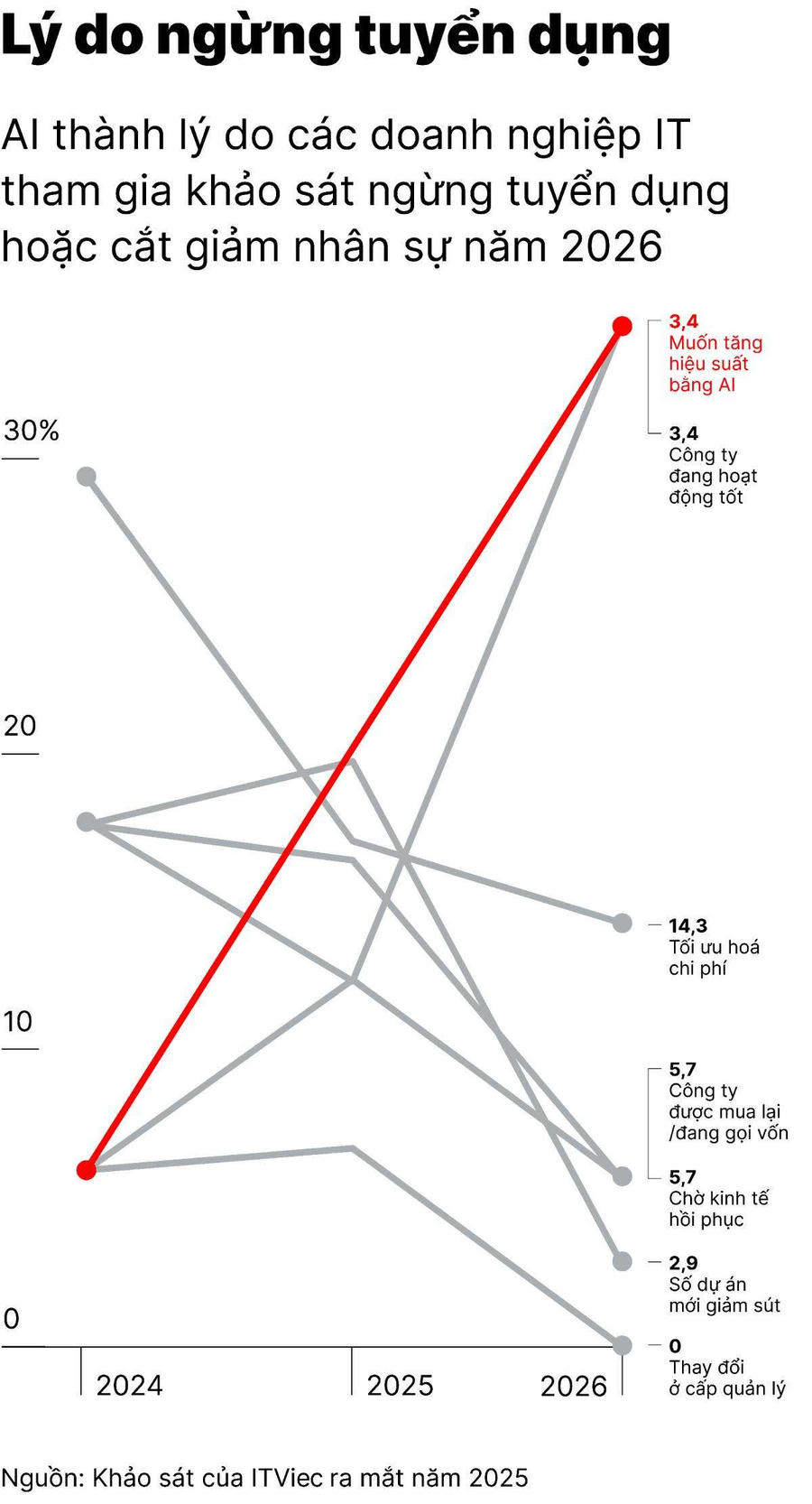Số liệu khảo sát của ITviec công bố năm 2025 đã lượng hóa xu hướng này. Tỷ lệ doanh nghiệp lựa chọn giải pháp tăng hiệu suất nhờ AI làm lý do chính để không tuyển thêm nhân sự đã tăng vọt từ mức 5,9% của năm 2024 lên 20,2% trong năm 2025. Dự báo con số này sẽ tiếp tục tăng lên mức 34,3% vào năm 2026. Đây là mức tăng trưởng mạnh nhất trong tất cả các nhóm nguyên nhân hạn chế tuyển dụng, cho thấy AI đang dần đóng vai trò thay thế nhu cầu nhân sự mới.