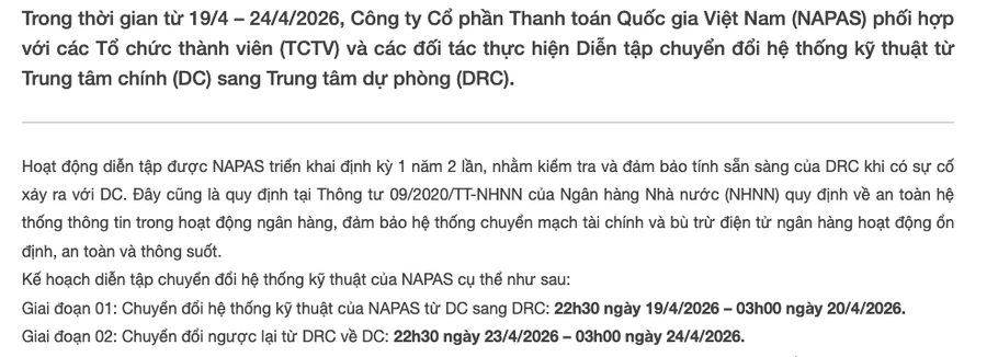 Tin90p.com - Napas triển khai diễn tập chuyển đổi hạ tầng kỹ thuật, nhiều giao dịch ngân hàng sẽ bị ngắt quãng