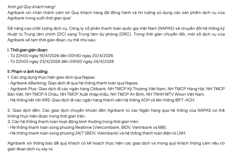Ngân hàng Agribank, ACB vừa phát đi thông báo về việc gián đoạn tạm thời một số dịch vụ chuyển tiền, thanh toán do liên quan đến kế hoạch diễn tập chuyển đổi hệ thống kỹ thuật của Napas.