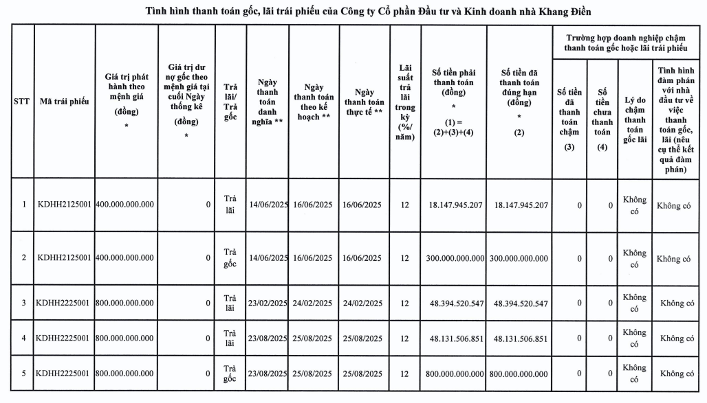 Còn hơn 226 tỷ đồng chưa giải ngân từ đợt chào bán cổ phiếu ESOP CTCP Đầu tư và Kinh doanh Nhà Khang Điền (mã ck: KDH) vừa có báo cáo sử dụng vốn, số tiền thu được từ đợt phát hành cổ phiếu theo chương trình lựa chọn cho người lao động (ESOP) năm 2024 và năm 2025. Theo đó, vào ngày 18/10/2024, Nhà Khang Điền đã chào bán thành công 10,8 triệu cổ phiếu ESOP cho 233 người lao động trong công ty với giá 17.000 đồng/cổ phiếu, qua đó thu về 183,6 tỷ đồng. Theo kế hoạch, số tiền thu được sẽ được dùng để bổ sung nguồn vốn kinh doanh cho công ty. ![]() Tính đến ngày 31/12/2025, Nhà Khang Điền đã sử dụng số tiền hơn 96,3 tỷ đồng, còn lại gần 87,3 tỷ đồng chưa được sử dụng. Ở thời điểm kết thúc đợt phát hành ngày 23/7/2025, Nhà Khang Điền cũng đã hoàn tất chào bán 9,96 triệu cổ phiếu ESOP với giá 14.000 đồng/cổ phiếu, qua đó huy động thành công hơn 139,4 tỷ đồng. Doanh nghiệp dự kiến số tiền thu được để bổ sung nguồn vốn kinh doanh cho công ty. Tuy nhiên, tính đến ngày 31/12/2025, Nhà Khang Điền chưa sử dụng số tiền thu được từ đợt phát hành cổ phiếu nêu trên. Nhà Khang Điền cho biết, trong thời gian chờ giải ngân số tiền chưa sử dụng từ 2 đợt phát hành ESOP nêu trên, nhằm tối ưu hóa dòng tiền, Ban Tổng Giám đốc công ty đã gửi ngân hàng có kỳ hạn để mang lại thêm lợi ích cho công ty. Đã thanh toán hơn 1.200 tỷ đồng tiền gốc, lãi cho 2 lô trái phiếu Ngày 30/3/2026, Nhà Khang Điền có văn bản công bố thông tin về tình hình thanh toán gốc, lãi trái phiếu gửi đến Ủy ban Chứng khoán Nhà nước, Sở giao dịch Chứng khoán TP HCM (HoSE), Sở giao dịch Chứng khoán Hà Nội (HNX) và nhà đầu tư trái phiếu. Theo đó, trong năm 2025, Nhà Khang Điền đã thanh toán tổng cộng hơn 1.214,6 tỷ đồng tiền gốc và lãi cho 2 lô trái phiếu mã KDHH2125001 và KDHH2225001. Trong đó, doanh nghiệp đã thanh toán hơn 18,1 tỷ đồng tiền lãi và 300 tỷ đồng tiền gốc cho lô trái phiếu mã KDHH2125001. ![]() Qua tìm hiểu, lô trái phiếu KDHH2125001 được phát hành từ ngày 14/6/2021, gồm 400 trái phiếu, tổng giá trị phát hành 400 tỷ đồng, kỳ hạn 4 năm. Mục đích phát hành lô trái phiếu này là nhằm tăng quy mô vốn hoạt động của công ty. Với lô trái phiếu mã KDHH2225001, Nhà Khang Điền đã thanh toán 96,5 tỷ đồng tiền lãi và 800 tỷ đồng tiền gốc cho lô trái phiếu này. Trái phiếu được phát hành từ ngày 23/8/2022, tổng giá trị phát hành 800 tỷ đồng, kỳ hạn 3 năm. Chi 2.552 tỷ đồng mở rộng quỹ đất và chốt lịch họp đại hội cổ đông Về hoạt động quản trị, Nhà Khang Điền ấn định ngày 25/3/2026 là ngày chốt danh sách cổ đông tham dự Đại hội đồng cổ đông thường niên 2026 với tỷ lệ thực hiện quyền 1:1. Cuộc họp dự kiến tổ chức trong tháng 4/2026, chi tiết về địa điểm và tài liệu họp sẽ được gửi trực tiếp đến cổ đông và đăng tải trên cổng thông tin điện tử của công ty. Về hoạt động đầu tư, doanh nghiệp đã thông qua chủ trương cho Công ty TNHH Kinh doanh Bất động sản Phúc Thông (công ty con do Nhà Khang Điền nắm giữ 99% vốn) nhận chuyển nhượng 99% cổ phần của Công ty Cổ phần Phát triển Bất động sản An Lập. Tổng giá trị của thương vụ thâu tóm này lên tới 2.552,7 tỷ đồng. Công ty An Lập được thành lập vào tháng 11/2022 với vốn điều lệ ban đầu 20 tỷ đồng. Đến tháng 4/2025, doanh nghiệp này chuyển sang mô hình công ty cổ phần và tăng vốn lên 400 tỷ đồng, trước khi tiếp tục nâng vốn điều lệ lên mức 800 tỷ đồng chỉ một tháng sau đó.