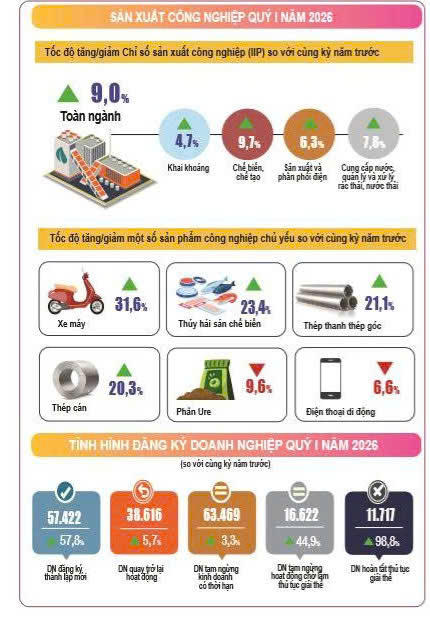 So với cùng kỳ năm trước, tăng 40,5% về số DN, tăng 78,1% về số vốn đăng ký và tăng 12,4% về số lao động. Vốn đăng ký bình quân một DN thành lập mới trong tháng Ba đạt 10,2 tỷ đồng, giảm 12,8% so với tháng trước và tăng 26,7% so với cùng kỳ năm trước. Bên cạnh đó, cả nước còn có hơn 7,9 nghìn DN quay trở lại hoạt động, tăng 28,3% so với tháng trước và giảm 13,3% cùng kỳ năm trước. ![]() Trong tháng Ba, có 5.059 DN đăng ký tạm ngừng kinh doanh có thời hạn, tăng 18,8% so với tháng trước và tăng 15,2% so với cùng kỳ năm 2025; Có 6.304 DN tạm ngừng hoạt động chờ làm thủ tục giải thể, tăng 80,5% và tăng 28,7%; Có 3.818 DN hoàn tất thủ tục giải thể, tăng 16,0% và tăng 78,7%. Tính chung quý I/2026, cả nước có hơn 57,4 nghìn DN đăng ký thành lập mới với tổng số vốn đăng ký gần 538,6 nghìn tỷ đồng và tổng số lao động đăng ký hơn 265,9 nghìn lao động, tăng 57,8% về số DN, tăng 51,0% về số vốn đăng ký và tăng 16,5% về số lao động so với cùng kỳ năm trước. Vốn đăng ký bình quân một DN thành lập mới trong quý I/2026 đạt 9,4 tỷ đồng, giảm 4,3% so với cùng kỳ năm trước. Tổng số vốn đăng ký bổ sung vào nền kinh tế trong quý I/2026 là hơn 1,3 triệu tỷ đồng, giảm 5,1% so với cùng kỳ năm 2025. Bên cạnh đó, cả nước có hơn 38,6 nghìn DN quay trở lại hoạt động (tăng 5,7% so với cùng kỳ năm 2025), nâng tổng số DN thành lập mới và quay trở lại hoạt động trong quý I/2026 lên 96,0 nghìn DN, tăng 31,7% so với cùng kỳ năm 2025. Bình quân một tháng có 32,0 nghìn DN thành lập mới và quay trở lại hoạt động. ![]() Theo khu vực kinh tế, trong quý I/2026 có 623 DN đăng ký thành lập mới thuộc khu vực nông, lâm nghiệp và thủy sản, tăng 89,4% so với cùng kỳ năm trước; Gần 13,8 nghìn DN thuộc khu vực công nghiệp và xây dựng, tăng 60,1%; Hơn 43,0 nghìn DN thuộc khu vực dịch vụ, tăng 56,6%. Tính chung trong quý I năm nay, số DN tạm ngừng kinh doanh có thời hạn là gần 63,5 nghìn DN, tăng 3,3% so với cùng kỳ năm trước; Hơn 16,6 nghìn DN ngừng hoạt động chờ làm thủ tục giải thể, tăng 44,9%; Hơn 11,7 nghìn DN hoàn tất thủ tục giải thể, tăng 98,8%. Bình quân một tháng có 30,6 nghìn DN rút lui khỏi thị trường. Kết quả điều tra xu hướng kinh doanh của các DN ngành Công nghiệp chế biến, chế tạo (CBCT) trong quý I/2026 cho thấy: Có 23,8% số DN đánh giá tình hình sản xuất kinh doanh tốt hơn so với quý IV/2025; 46,1% số DN cho rằng tình hình sản xuất kinh doanh ổn định và 30,1% số DN đánh giá gặp khó khăn. Dự kiến quý II/2026, có 40,8% số DN đánh giá xu hướng sẽ tốt lên so với quý I/2026; 37,5% số DN cho rằng tình hình sản xuất kinh doanh sẽ ổn định và 21,7% số DN dự báo khó khăn hơn. Trong đó, khu vực DN FDI lạc quan nhất với 80,0% số DN dự báo tình hình sản xuất kinh doanh quý II/2026 tốt hơn và giữ ổn định so với quý I/2026; Tỷ lệ này ở khu vực DN Nhà nước và khu vực DN ngoài Nhà nước lần lượt là 79,6% và 77,3%. Phân tích rõ hơn về nguyên nhân các khó khăn khiến DN rời bỏ khỏi thị trường, bà Phí Thị Hương Nga – Trưởng Ban Thống kê Công nghiệp Xây dựng (Cục Thống kê) cho hay: Theo thống kê, các DN bán buôn, bán lẻ, sửa chữa ô tô, xe máy chiếm gần 40% DN rút lui khỏi thị trường. Điều này cho thấy tác động của thương mại điện tử và xuất khẩu đã ảnh hưởng rõ rệt đến thị trường và các DN. Bên cạnh đó, hai nhóm DN trụ cột là DN ngành Xây dựng và Công nghiệp CBCT cũng bị ảnh hưởng khá nặng nề, với bình quân mỗi nhóm ngành có tới gần 9000 DN rút lui khỏi thị trường. Do ảnh hưởng của cầu tiêu dùng giảm, nhiều DN thương mại, dịch vụ đã phải ngừng kinh doanh. Bên cạnh đó, có tới 45,6% DN trong ngành Công nghiệp CBCT bị khó khăn do nhu cầu tiêu dùng thấp. Với nhu cầu ttiêu dùng thấp, mà cạnh tranh ngày càng cao, càng khiến DN khó khăn hơn. Theo đó, có tới 48,9% DN phải chịu sức ép cạnh tranh trong các DN cùng ngành... ![]() Liên quan đến chi phí năng lượng, nhiên liệu đầu vào và logistics tăng cao khiến DN phải chịu tác động kép. Thực tế, có tới 27,3% DN khu vực Công nghiệp CBCT bị ảnh hưởng do thiếu hụt nguồn cung nguyên vật liệu và chi phí tăng cao. Trong ngành Xây dựng, cũng có tới 70,1% DN gặp khó khăn và phải ngừng thi công do giá nguyên vật liệu tăng cao. Thực trạng này làm cho biên lợi nhuận của DN bị ăn mòn khiến DN bị suy giảm. Nợ đọng ngân hàng, nguyên vật liệu kéo dài đã ảnh hưởng nghiêm trọng đến dòng tiền của DN, đặc biệt là DN trong lĩnh vực Công nghiệp CBCT, chỉ có DN điện tử, ngành may mặc, da giày nhúc nhắc có đơn hàng. Tuy nhiên, ở góc độ tích cực, bà Hương Nga cho biết, chúng ta cũng chứng kiến rất nhiều DN thành lập mới, thay đổi mô hình quản trị, thích ứng với tình hình. Điều đó cũng cho thấy sức khỏe của DN đã được phục hồi khá tốt. Và sự phục hồi đó sẽ nâng cao hơn với những chính sách vĩ mô có trọng tâm, trọng điểm của Chính phủ trong các quý tới, để làm